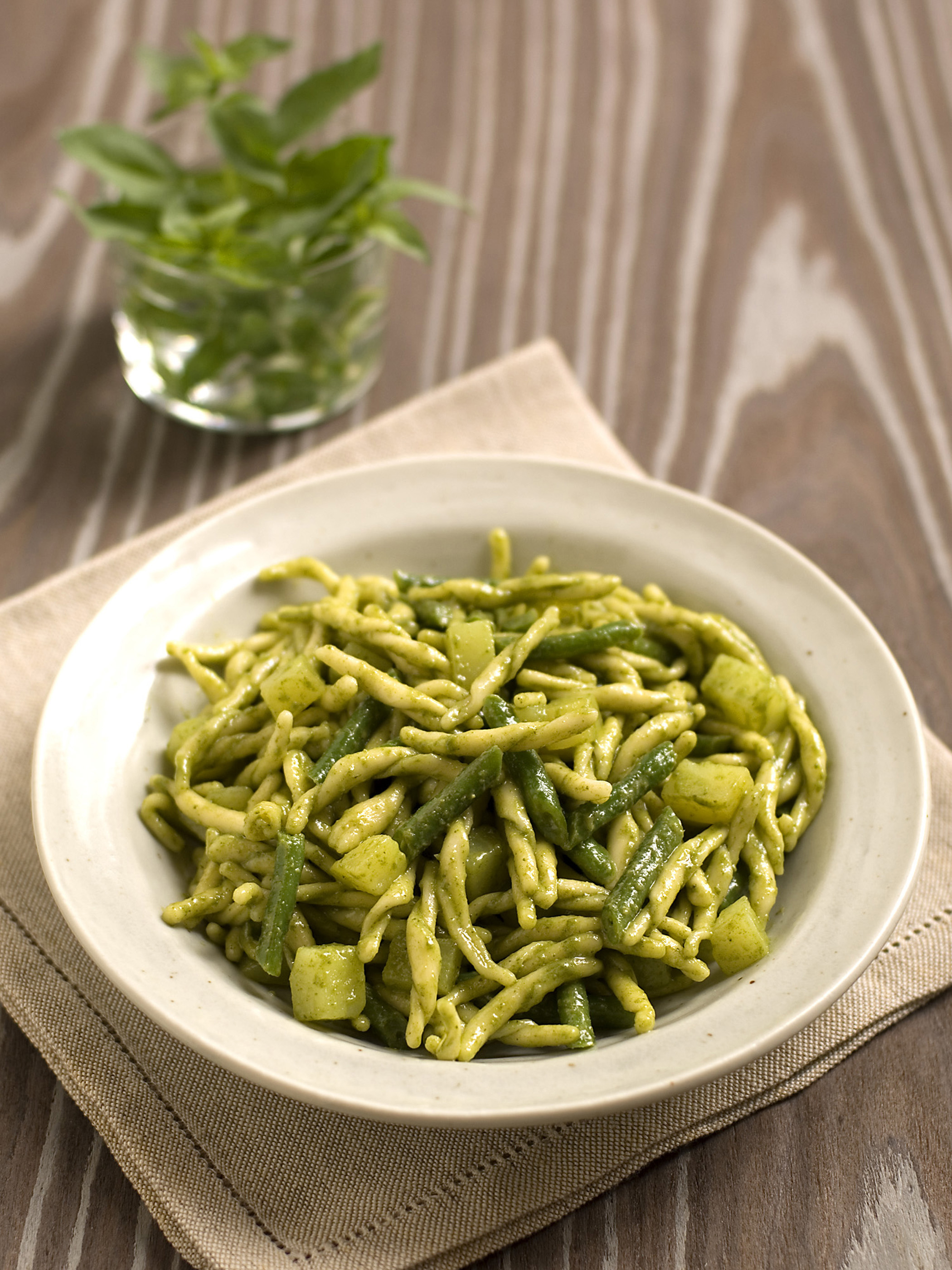 Traditionally, pasta with pesto alla genovese is served with boiled potato cubes and green beans.